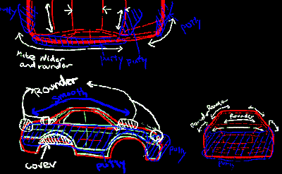 リアタイヤは半分隠す必要があるため、リアホイール辺りサイドカーブ自体広げる形で出します。
