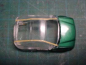これは私の持論なんですが、Gr.5カーは、やっぱりオーバーフェンダーが肝なんです。ところがBit-CharGの場合、構造的に車輪の位 置を広げにくいので、相対的に車輪を出っ張らすことで対応するしかないんです。 じゃあどーやってオーバーフェンダーを表現するかと言えば、つまりは座席まわりのボディーを狭くするしかないですね。で、写 真のテープ幅のように、サイドウィンドゥと屋根の間を、左右それぞれ1mmずつ詰めようと考えました。 |